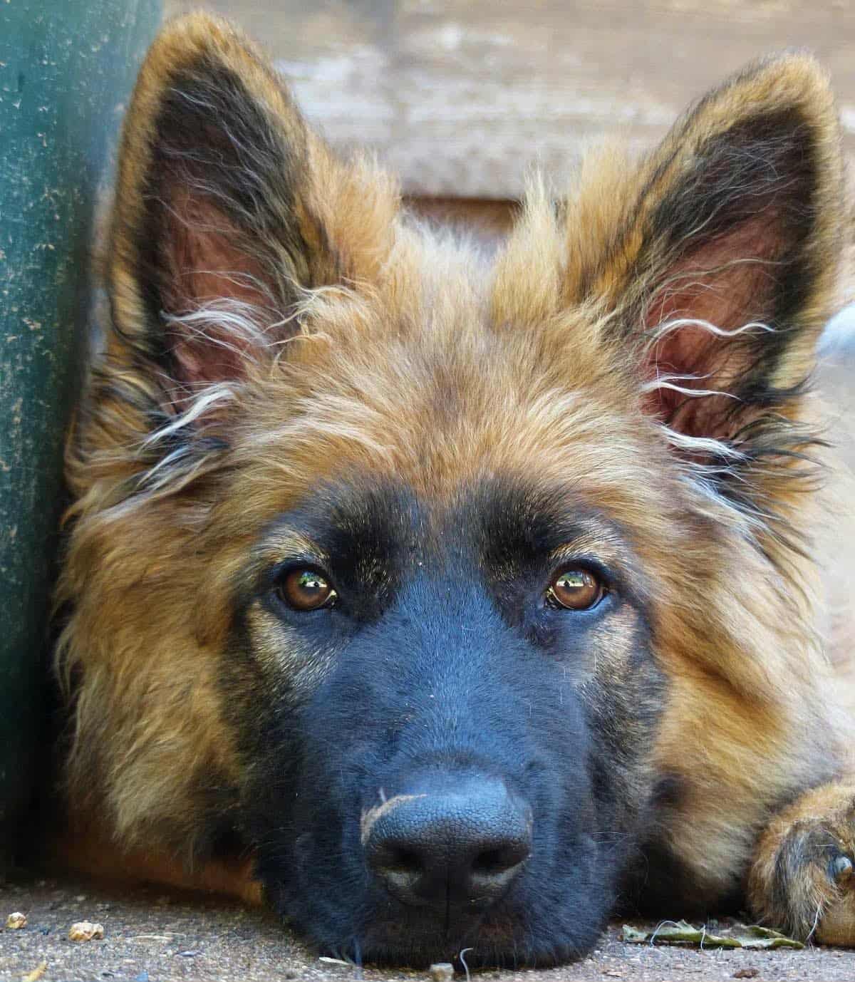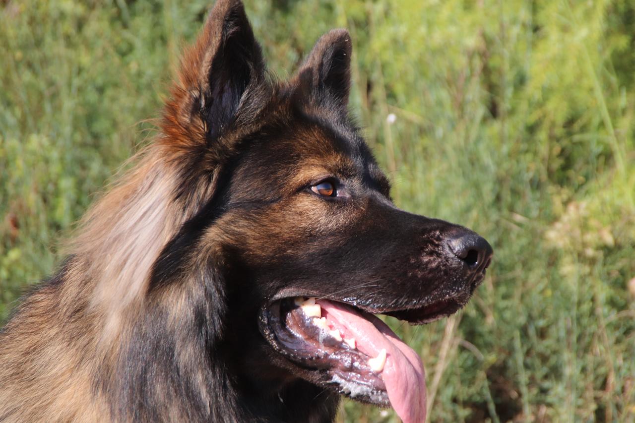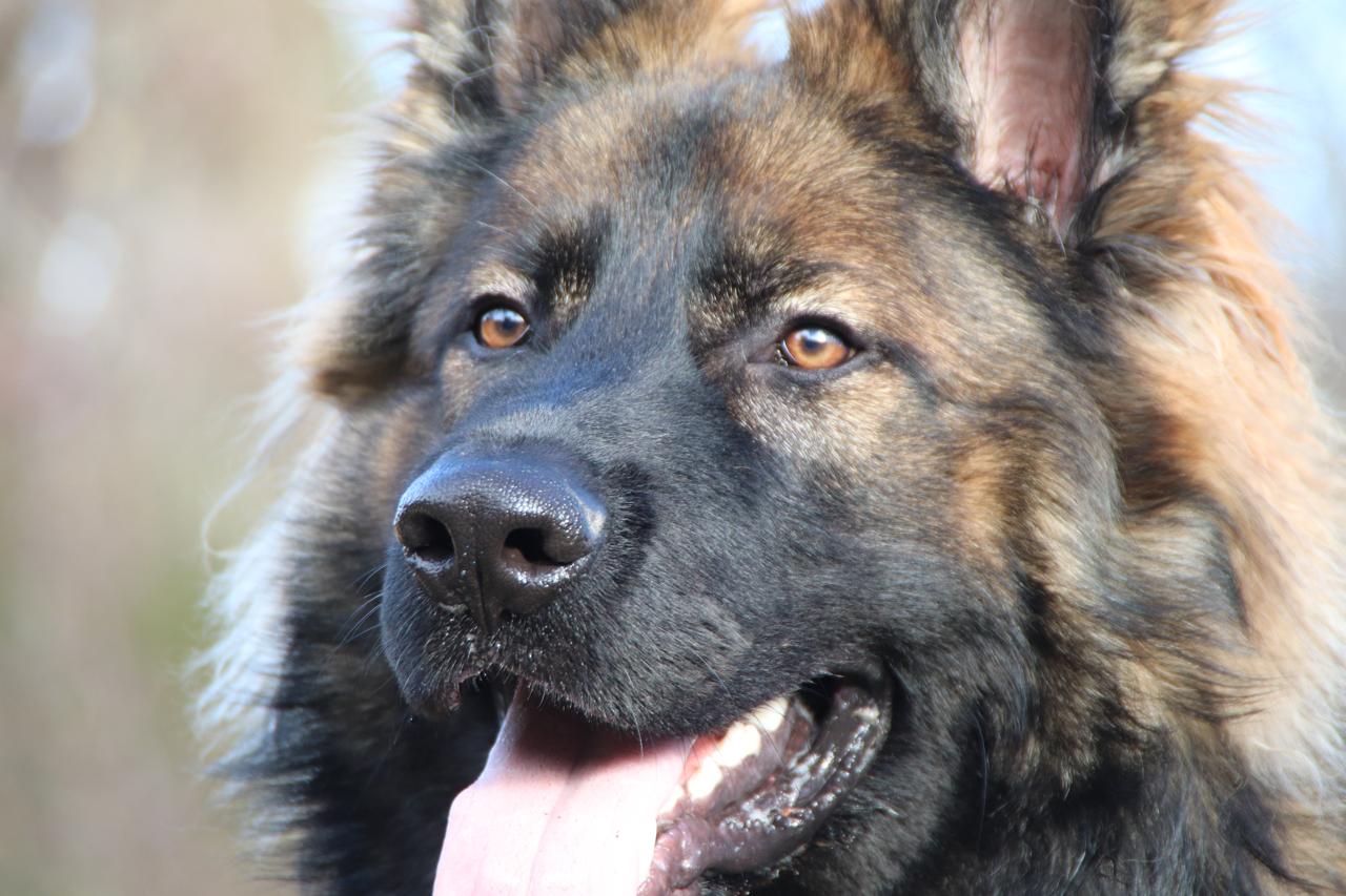 Jango a une tête large et carrée avec un stop de nez bien marqué. Ses jolis yeux en amandes bien foncés en disent long sur ses réflexions. Ses oreilles sont bien dressées et joliment implantées.